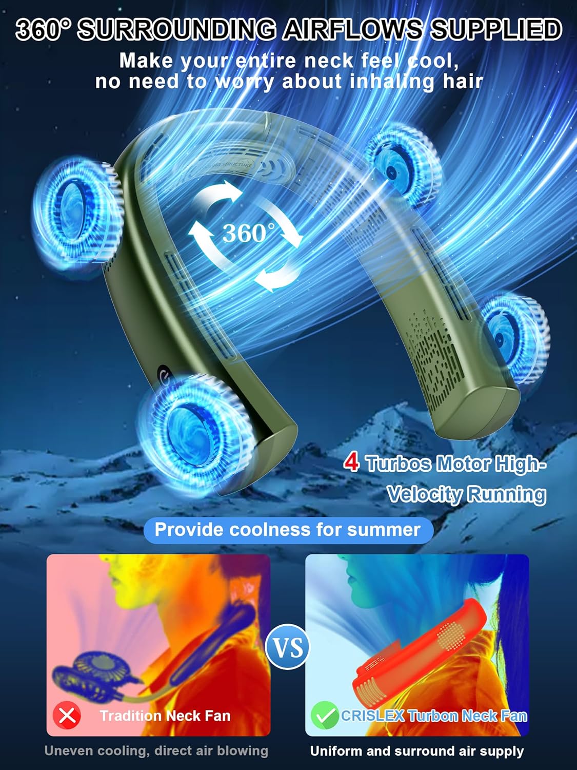 Stay cool and comfortable wherever you go with our Portable Neck Fan! Featuring 360° airflow and a rechargeable 7000mAh battery, this hands-free fan provides quiet and powerful cooling. With neck support and 4 turbo speeds, it's perfect for hot flashes or travel. Stay refreshed with our portable fan.